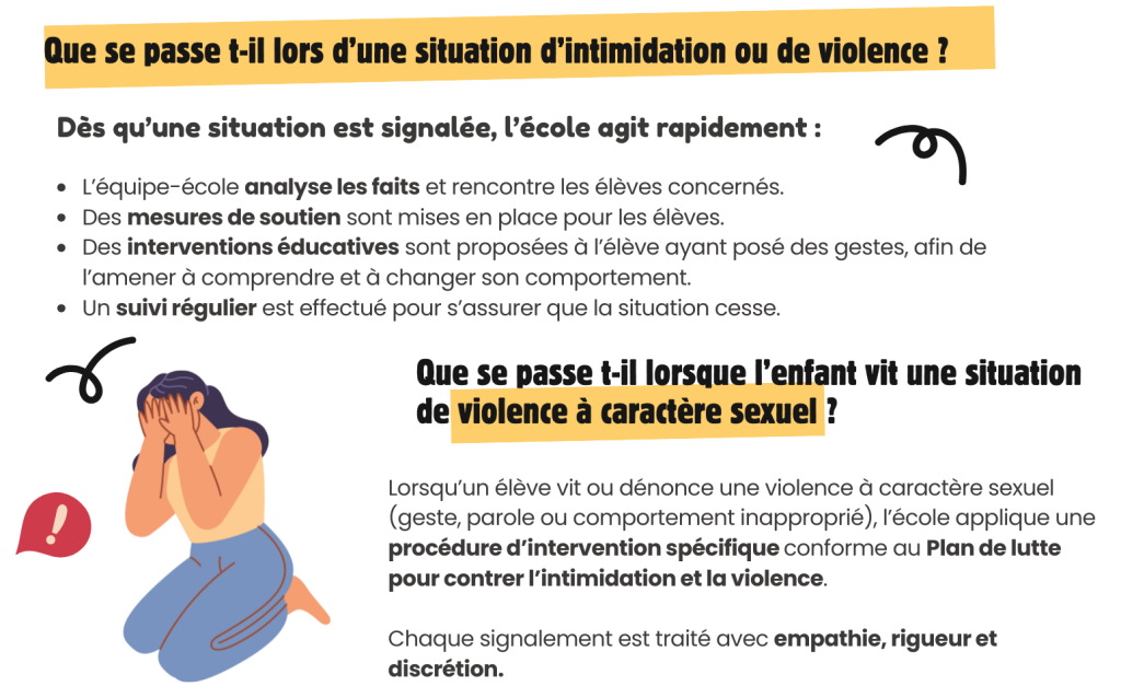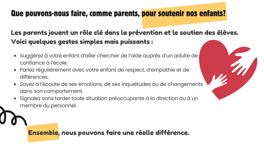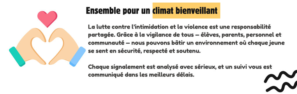 Nous avons à cœur d’offrir à chaque élève un milieu d’apprentissage sain, sécuritaire et respectueux. La prévention de l’intimidation et de la violence fait partie intégrante de notre mission éducative.